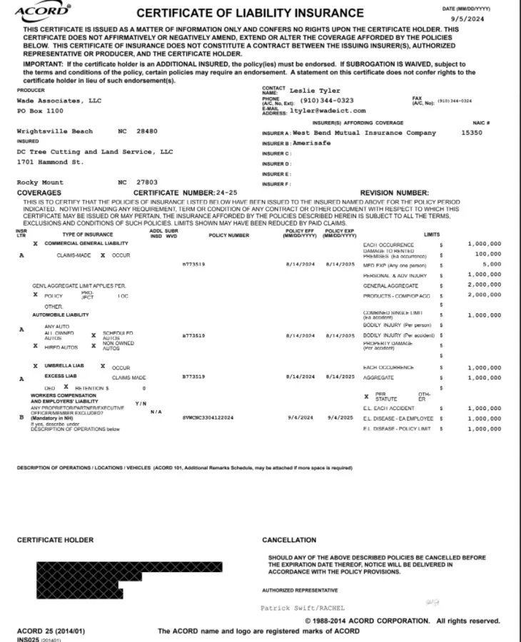 DC Tree Cutting and Land Service has attached a sample certificate for your reference. This sample illustrates our insurance coverage and limits.